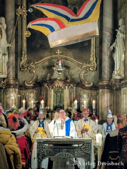 Wenn der Fastnachtsgottesdienst in der Galluskirche naht, wird mancher Gläubige etwas unruhig. Die Kritik an den Verantwortlichen rührt von der Auffassung her, Fastnacht habe im Haus Gottes nichts zu suchen, sie ein „Frevel“. Die Resonanz am Abend zeichnete jedoch ein klares Bild, dass dies die große Mehrheit in der Gemeinde anders sieht. Bunt, fröhlich und zugleich nachdenklich ging es beim 19. Fastnachtsgottesdienst in der Galluskirche zu. Über dem Altarraum schwebte eine großformatige Narrenkappe, die Kirchenbänke waren dicht besetzt, viele Besucher kamen in Kostümen. Fastnacht und Glaube trafen sich hier bewusst – nicht als Gegensätze, sondern als Verbindung.