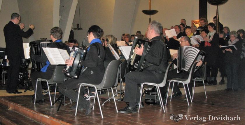 Pfarrer Zirmer begrüßte die Gäste und betonte, dass vieles musikalisch Dargebotene noch eindringlicher sei als die Sprache und wünschte allen einen angenehmen Nachmittag. Zur Aufführung kamen die „Missa Brevis“ (kurze Messe), eine Vertonung des Messordinatoriums in gottesdiensttauglicher Weise, und das "Concerto d ́Amore", das von Jacob de Haan, einem niederländischen Komponisten und Musiker, im Original für Blasorchester komponiert, jedoch von Stefan Finkenauer und dem Akkordeonorchester sehr gut umgesetzt wurde. Charles Gounod verwendete für das Ave Maria die Musik von Johann Sebastian Bach und schuf so eines der bekanntesten Stücke der Klassik, hervorragend interpretiert von Paula Finkenauer (Solo-Akkordeon) und Stefan Finkenauer an der Orgel.