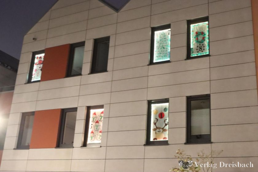 Noch bis Heiligabend „öffnet“ sich an jedem Spätnachmittag ein weiterer Beitrag zu dem städtischen Adventskalender, wenn es dunkel wird und in dem Büroraum hinter einer weiteren Fensterscheibe das Deckenlicht eingeschaltet wird. Die dekorierten Fenster sind mit einem Datum gekennzeichnet, und wie wir von Kindheit an gelernt haben, gibt es jeden Tag genau ein neues Türchen zu öffnen, in diesem Fall ein leuchtendes Fenster zu entdecken.