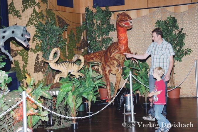 Die bayrische Schaustellerfamilie Neigert hatte mit ihrem Ausstellungsequipment Quartier bezogen und lockte zu einem Rundgang zwischen den Riesen der Urzeit. Einige wenige der Kunststoff-Exemplare waren beweglich, die meisten aber waren für die Kinder eher nur eine Vergrößerung ihrer heimischen Spielzeugdinos. Eine Urwaldkulisse und Geräusche des Dschungels sollten den Ausstellungsbesuch authentisch wirken lassen. Ein Film über das Leben der Dinosaurier beziehungsweise ein Zeichentrickfilm für Kleinkinder, Schautafeln und einige nachgebildete Fossilienfunde rundeten die Dinoshow ab. Familie Neigert führte in früheren Jahren einen Zirkus, gab diesen aber wegen der immer schwierigeren wirtschaftlichen Lage und den zunehmend höheren Auflagen für die Tierhaltung auf. Seit fünf Jahren touren sie daher mit Plastikdinosaueriern, die meist in China gefertigt werden, durch die Lande. Kleinstädte seien die Ziele des Familienunternehmens. Leider sei der acht Meter große Tyrannosaurus, der vor der Stadthalle für die Ausstellung werben sollte, noch in der ersten Nacht zerstört worden, sodass die Figur nun nach Hamburg zur Reparatur gebracht werden müsse.