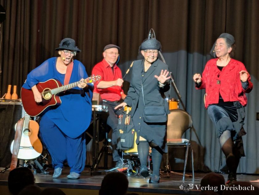 Dann betraten sie die Bühne: Karin Simon, Monika Zintl, Isolde Baldauf und Frank Wendeberg . Seit 2014 touren die vier durch ganz Deutschland – mit einem Programm, das den Tod aus der Tabuzone holt. "Wir setzen uns mit todsicheren Absichten auseinander und begleiten Sie ins Jenseits – zumindest musikalisch", versprach Simon augenzwinkernd zu Beginn.