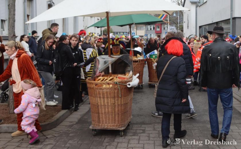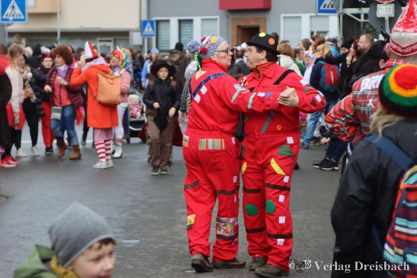 Getanzt wird beim Flörsheimer Umzug bisweilen nicht nur von den aktiven Gruppen, dieses Paar nutzt die Wartezeit auf den Zug für eine kleine Einlage.