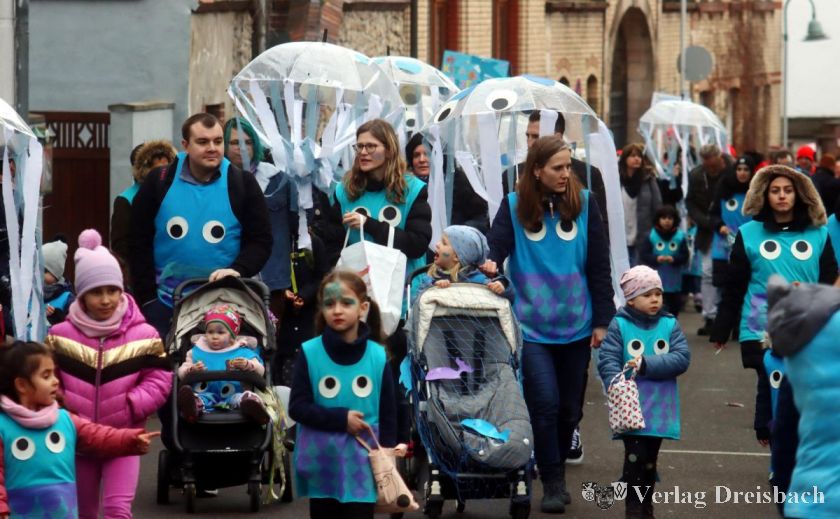 Beim Kindermaskenumzug zeigte die Kita Purzelbaum sich mit ihrer Ausstattung bestens auf das etwas regnerische Wetter vorbereitet.
