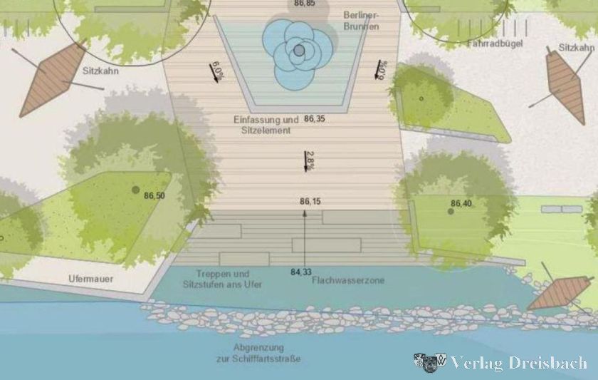 Für Erstaunen sorgt allerdings der zum Fuß der Treppen angebotene Planschbereich. Jedenfalls beim aktuellen Pegelstand wird es schwer, in den Pfützchen den in Aussicht gestellten Erfrischungseffekt an den Waden zu erzielen, geschweige denn Kindern einen Wasserspielplatz zu bieten. Die dicken Wacker, die die Ausbuchtung in den Fluss in einem leichten Bogen abgrenzen sollten, füllen so, wie es derzeit gestaltet ist, tatsächlich mehr oder weniger die gesamte vorgelagerte Zone. Den in den Gremien zu hörenden Bedenken, dass so ein Badebereich im Fluss für Kinder eine Gefahr darstellen könnte, ist mit dieser Ausführung eindrucksvoll das Wasser abgegraben.