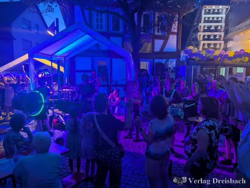 Gegen 21 Uhr war die Kerb bestens besucht, die Bänke gefüllt und der Platz in Bewegung. Viele Gäste trugen die Farben Lila und Gelb und gaben dem Abend ein stimmungsvolles Bild. Dann betraten die Trommler die Mitte des Platzes vor der Bühne und eröffneten mit den markanten Rhythmen von „We Will Rock You“ die Aktion.