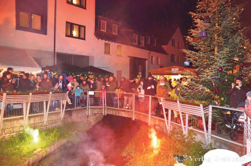 „Die Bach“ brannte zu später Stunde, nachdem die Feuerwehr kleine Leuchtfeuer und einen Lagerfeuerturm entzündet hatte. Die Marktbesucher säumten „die Bach“ und erfreuten sich mit wärmendem Glühwein an der besonderen Stimmung.