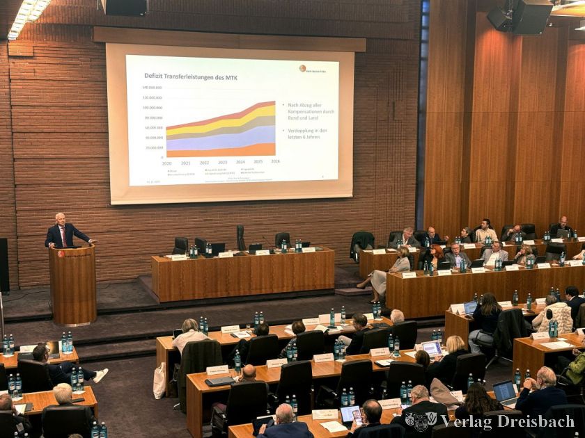 Der Landrat präsentierte einen Etatentwurf, bei dem man an einer Zahl ablesen kann, dass in seinem Gebiet die finanzielle Notlage noch keine Untergangsphase einzuleiten beginnt: Die Kreisumlage für die zwölf Städte und Gemeinden im MTK bleibt 2026 im Vergleich zu diesem Jahr unverändert bei 36,25 Prozent. Wie im Vorjahr, werde der Etat des Kreises nur „mit Anstrengungen“ ausgeglichen sein. Das ist im Wesentlichen der Griff in die immer noch gut gefüllten Rücklagen, um das erwartete Defizit im Ergebnishaushalt von 14,5 Millionen Euro aufzufangen. Der Sparstrumpf leert sich demnach von 84,53 Millionen Euro Anfang 2025 über 66,23 Millionen Euro Ende 2025 auf dann nur noch 51,73 Millionen Euro. So aber wird der Kreis der Aufsichtsbehörde, dem Regierungspräsidium in Darmstadt, einen genehmigungsfähigen Haushalt vorlegen.