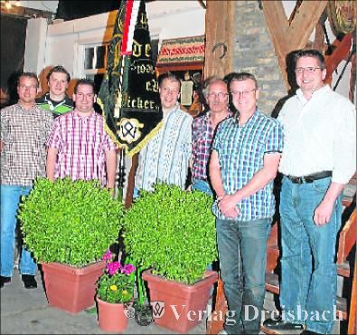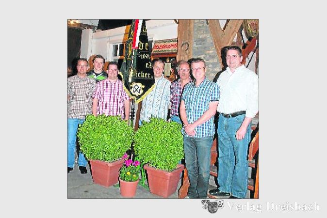 Vorstandsmitglieder des Club Fidelios, Fähnrich und Fahnenbegleiter gruppierten sich anlässlich des 20-jährigen Bestehens zum Gruppenfoto um die Vereinsfahne. (Foto: Dörhöfer)