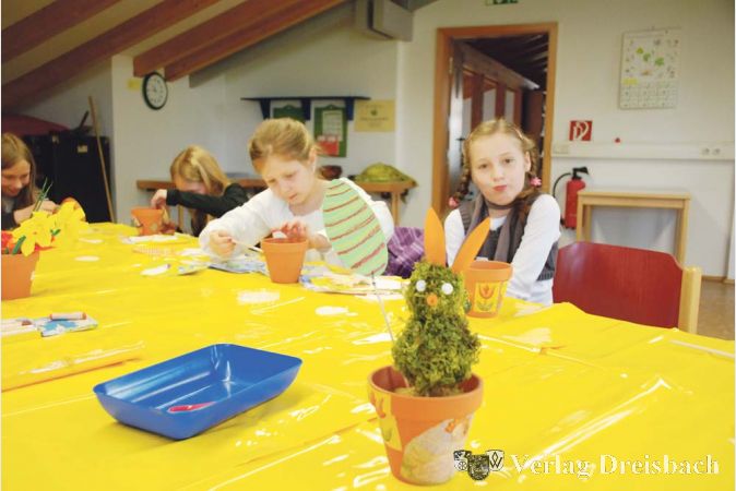 Zunächst wurde ein Terracotta-Tontopf mit Ostermotiven über Serviettentechnik verziert und so waren im Nu bunte Eier, Küken und Häschen auf den Töpfen zu sehen. War der erste Schritt abgeschlossen, wurde der Topf mit Sand gefüllt, um dann einen Hasen aus Moos hineinstecken zu können. Der Hase bestand aus zwei mit Moos und Draht umwickelten Styroporkugeln und erhielt mit Ohren, Nase und Puschelschwanz erst sein richtiges Aussehen. Nach dem Hasenbasteln fertigten die Kids, die ganz konzentriert und ruhig ans Werk gingen, noch viele kräftig leuchtende Osterglocken aus Krepppapier.