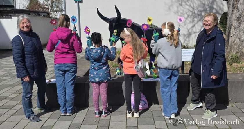 Unter der Anleitung durch Cäcillia Habicht und Rosi Reinelt, Mitglieder von Freundeskreises Pérols-Flörsheim, bastelten Kinder in der vorösterlichen Ferienwoche in zwei Gruppen im Alleler Reinelt. Zu sehen ist die Mittwochsgruppe am Zielobjekt, den Pérols-Stier auf dem Rathausplatz, der entsprechend des nahenden Osterfestes geschmückt wurde. An der Dienstagsgruppe nahmen sechs Kinder teil.