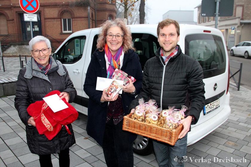 Rita Klee vom Caritasausschuss der Kirchengemeinde St. Gallus, der Leiter des Amtes für Familien, Soziales und Wohnen, Simon Dylla, und die Fachbereichsleiterin Senioren und Soziales, Martina Eisenhauer, überbrachten ein kleines Geschenk in die Heime in Rüsselsheim und Raunheim. Zu den weiter entfernt liegenden Häusern fahren Rita Klee und ihre Tochter Manuela; insgesamt legen sie dabei eine Strecke von mehr als 500 Kilometern zurück.