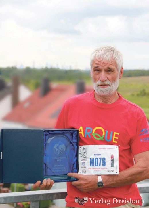 In diesem Jahr packte ihn erneut der Ehrgeiz: Die zwölf Minuten wollte er unterbieten. Am 3. Juni startete er als Nummer M 76. Nach genau elf Minuten und 53 Sekunden durchbrach er die Ziellinie. Damit war er der Schnellste in seiner Altersklasse M 70 (Männer über 70 Jahre). Folge: In der Schillerstraße 1 in Weilbach wohnt seit einigen Wochen der „Deutsche Towerrunning Champion 2012“, also der Deutsche Meister in der Altersklasse M 70 im Treppenlaufen.