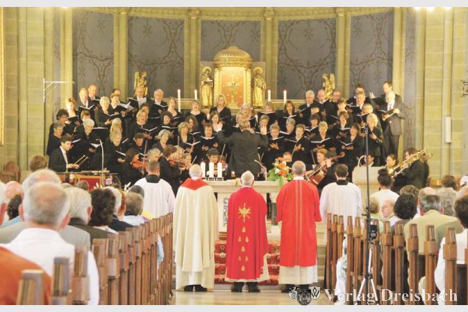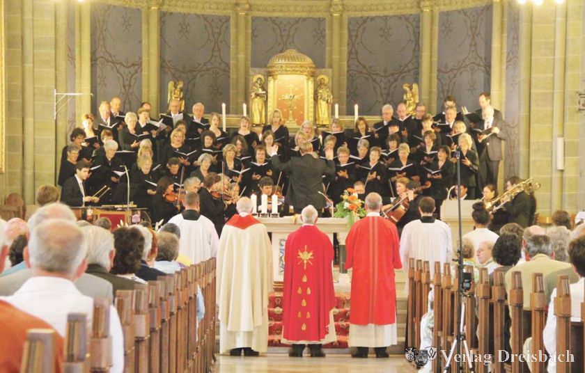 „So möchte ich mit 100 Jahren auch aussehen“, schmunzelte Pfarrer Lomberg zu Beginn dieses Festgottesdienstes auf den Chor seiner Kirchengemeinde deutend. Nicht nur damit kam zum Ausdruck, mit welcher Sympathie man dem Chor in St. Martinus in Hattersheim verbunden ist, immer wieder während des gesamten Pfingstgottesdienstes fand der Pfarrer Parallelen zwischen Kirche und Chorgesang. Auf die große Bedeutung des heute vielfach nur noch als „willkommenes Ausflugsfest“ gefeierte Pfingstfest als eigentliches „Geburtsfest“ der Kirche hinweisend, stellte er fest: „Ich bin froh, dass der Chor sein Jubiläum gerade an Pfingsten – einem der kirchlichen Feste, an denen die Kirche nicht überfüllt ist – feiert, gerade in der engagierten Chormusik kommt etwas davon herüber, wie man für Kirche Begeisterung empfinden kann.“ Und das war für die Gemeinde durchaus auch zu hören – der Chor erfreute sie während des Gottesdienstes begeistert und stimmgewaltig mit Kompositionen von Rutter, Mozart und Georg Friedrich Händel, wieder einmal exzellent begleitet vom Kammerorchester Collegium Musicum Frankfurt, Chor und Orchester wurden souverän geführt vom Dirigenten Jens-Uwe Schunk. Pfarrer Lomberg wies auch darauf hin, welche wichtige eigene Rolle gerade die Kirchenmusik dabei spielt, wenn die Kirche ihrem Auftrag, nach dem Sprachwunder an Pfingsten an die Öffentlichkeit zu treten und den christlichen Glauben in der Welt zu verkünden, nachkommt. Auch seien „Chor und Dirigent“ gewissermaßen ein „Bild“ für Kirche, findet Pfarrer Lomberg: „In beiden hat jede Stimme ihre eigene Stimmlage und eigene Bedeutung, aber nur im Zusammenklang wird ein harmonisches und vielstimmiges Ganzes daraus.“ Selbstverständlich wurde der Chor mit seinen jetzigen und ehemaligen Mitgliedern an diesem Festtag von der Gemeinde auch ausdrücklich in ihr Gebet aufgenommen. Zum Abschluss nahm Pfarrer Lomberg noch einmal den Faden zum „100-jährigen Geburtstag“ auf, indem er die Frage in den Raum stellte: „Was schenkt man einem 100-Jährigen, der schon alles hat und nichts besonderes braucht? Da wird immer geraten: Geld! Und das täte unserem Kirchenchor auch gut, die Gestaltung so eines Jubiläums ist teuer, wer dem Chor also etwas zum Geburtstag schenken möchte, ist sicher sehr willkommen.“