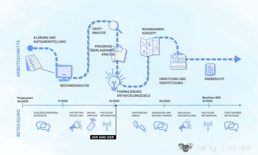 Der Prozess begann im Juni 2025; bis Ende 2027 soll das ISEK beschlossen werden, bevor anschließend die Umsetzung startet.