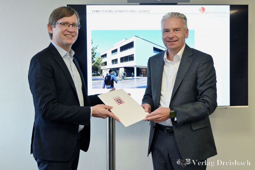Der Erweiterungsbau der Heinrich-Böll-Schule Hattersheim (HBS) im Standard „Passivhaus Plus Solar“ wird vom Land Hessen gefördert. Wie Landrat Michael Cyriax mitteilt, wird das Projekt für die Energie-Investitionen mit rund einer Million Euro bezuschusst. Staatssekretär Jens Deutschendorf vom Ministerium für Wirtschaft, Energie, Verkehr und Wohnen übergab im Landratsamt den entsprechenden Bewilligungsbescheid. In den Erweiterungsbau, der nach derzeitigem Stand Anfang 2026 fertig sein soll, investiert der Kreis insgesamt rund 15,7 Millionen Euro.