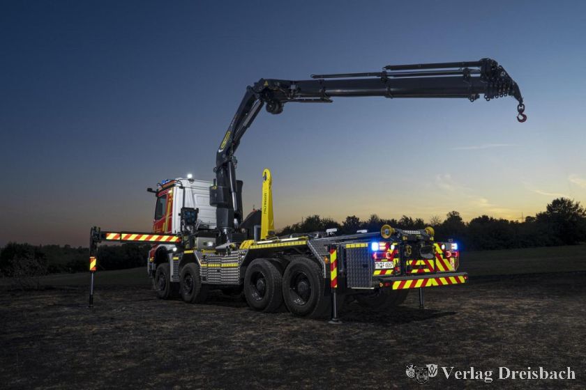 Das WLF-Kran basiert auf einem Mercedes-Benz Arocs 4151 mit einem zulässigen Gesamtgewicht von 32 Tonnen. Der verbaute Ladekran vom Typ Palfinger PK 37.002 TEC7 erreicht eine maximale hydraulische Reichweite von 21,8 Metern und hebt Lasten von bis zu sechs Tonnen bei sechs Metern Ausladung.