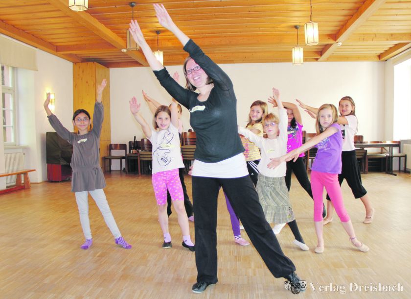 Jetzt ist aber erst mal eine kleine Trinkpause angesagt. „Trinken ist wichtig, wenn man tanzt!“, sagt Elisa Hofmann und die Mädchen laufen gerne zu ihren Taschen um ihre Trinkflaschen zu holen und sich kurz zu erfrischen. Auch die Dehnungsübungen, die zum Tanzen dazugehören, machen Spaß: die jungen Tänzerinnen recken den „Schwanenhals“, binden sich mit durchgedrückten Knien imaginäre Schuhbändel, rollen sich in die Hocke wie eine Schnecke und genauso wieder nach oben. So gedehnt und gestreckt kann man gleich noch einmal voller Schwung die ganze Choreographie durchtanzen.