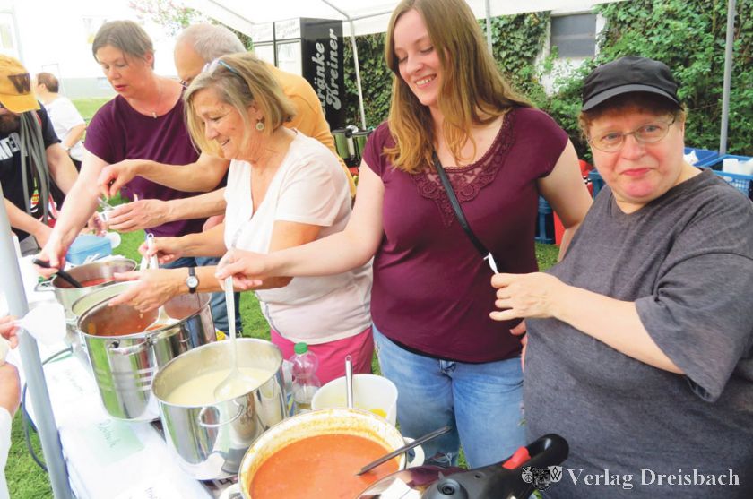 Zu verkosten waren etwa die „Dansk Rodfrugt-Suppe“, für die Ruth Hinsinger drei verschiedene alte Kartoffelsorten – auch lila-farbene – mit drei verschiedenen alten Karottensorten (gelbe, rote und violette) und roter Beete veredelte. Natürlich waren alle Zutaten frisch vom Markt. Die Tomatensuppe „á la Mama“ von Margritt Kupfer war nicht nur fruchtig aromatisch, sie war auch sehr lecker pikant gewürzt. Thomas Kettenbach hatte seine Vichyssoise, eine wunderbar cremige, gut gekühlte Kartoffel-Lauch-Suppe, mit dem elektrischen Lastenfahrrad von Wiesbaden nach Hattersheim gebracht; und er krönte jede Probiertasse mit Schnittlauch und Croutons. Hanni Jauerneck bot eine kräftige Böhmische Kartoffelsuppe an, die Köche vom Psychosozialen Zentrum hatten eine vollwertige, cremige Spargelsuppe mit vielen knackigen Spargelstücken und einem sonnengelben Klecks Mangopüree gezaubert. Gabriele Janda brachte mit ihrer aromatisch duftenden Ratatouille einen Hauch Provence in die Siedlung. Mit kräftigen grünen Kräuterstipseln lockte die sahnige Petersilienwurzelsuppe von Chris Savage die Feinschmecker an, Gloria Gotzhein bot zu ihrem Russischen Borschtsch in der typisch kräftigen Farbe der roten Beete wahlweise einen Klecks Schmand mit oder ohne Knoblauch an.