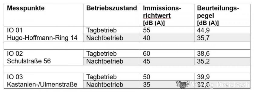 Ziel der durchgeführten Messungen war es, festzustellen, wie sich die Messwerte im Vergleich zu den Immissionsrichtwerten darstellen. Hierbei wurde im regulären Tagbetrieb (6 bis 22 Uhr) und im Nachtbetrieb (22 bis 6 Uhr) gemessen. Mit der Messung war die DEKRA, ein unabhängiges, akkreditiertes Messinstitut, beauftragt worden. Gemessen wurde am 12. und 13. Oktober mit einem geeichten Präzisionsschallpegelmesser. Als Messstellen waren nach Rücksprache mit dem Regierungspräsidium Darmstadt, DEKRA und NTT Data drei Immissionsorte festgelegt worden: Hugo-Hoffmann-Ring 14, Schulstraße 56 und Ecke Kastanienstraße / Ulmenstraße. Die von NTT bei dem Nachbarschaftsdialog gezeigten Beurteilungspegel kann man im Detail in der Tabelle nachlesen. Es ergab sich hieraus, dass die gemessenen Werte zu keiner Zeit und an keiner Messstelle die Immissionsrichtwerte überschritten.