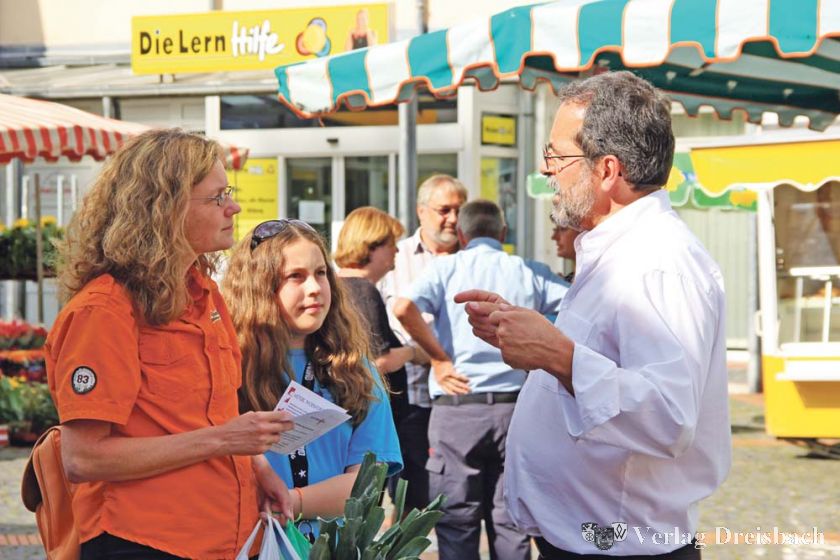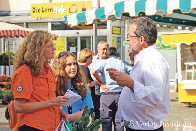 Marga Schmitt-Reinhart und Winfried Pohl sprachen die Hattersheimer Bürger direkt und persönlich auf dem Hattersheimer Wochenmarkt an und boten ihnen die offizielle Einladung der Stadt Hattersheim zu den Bürgerwerkstätten am Dienstag, 14. August, und Dienstag, 28. August, zum Mitnehmen an. Nur wenige Passanten schüttelten den Kopf und gingen einfach weiter, die meisten blieben stehen und zeigten sich interessiert, oft entwickelten sich längere Gespräche.