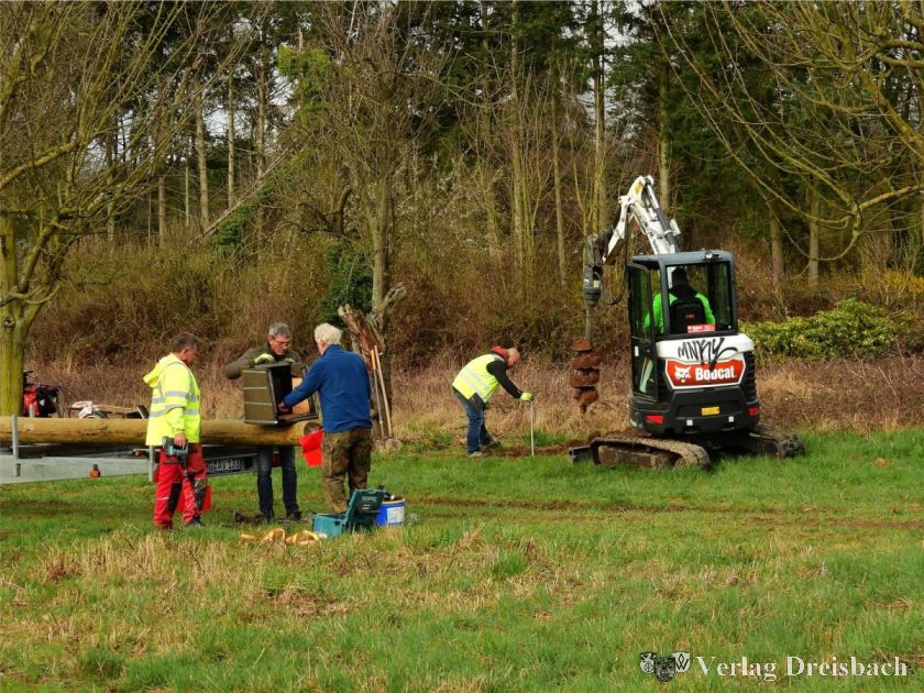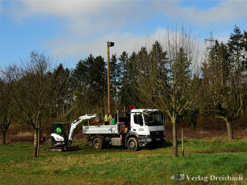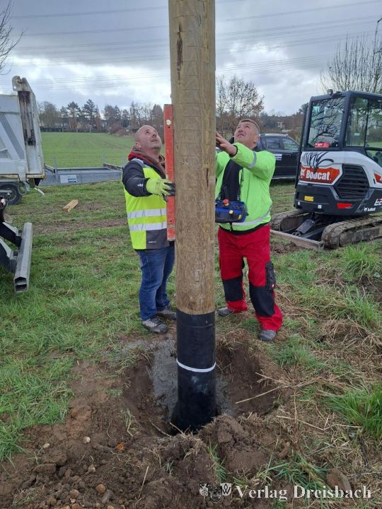 Am Donnerstag, 13. März, löste die Syna ihr Versprechen ein. In dem etwas unwegsamen Gelände kein Kinderspiel. Vier starke und mit dieser Materie gut vertraute Mitarbeiter sowie ein kleiner Maschinenpark mit Erdbohrer, Hebekran und Kleinbagger waren gut zwei Stunden im Einsatz. Anschließend ragte der Mast zehn Meter aus der Erde, zwei Meter stecken im Boden.