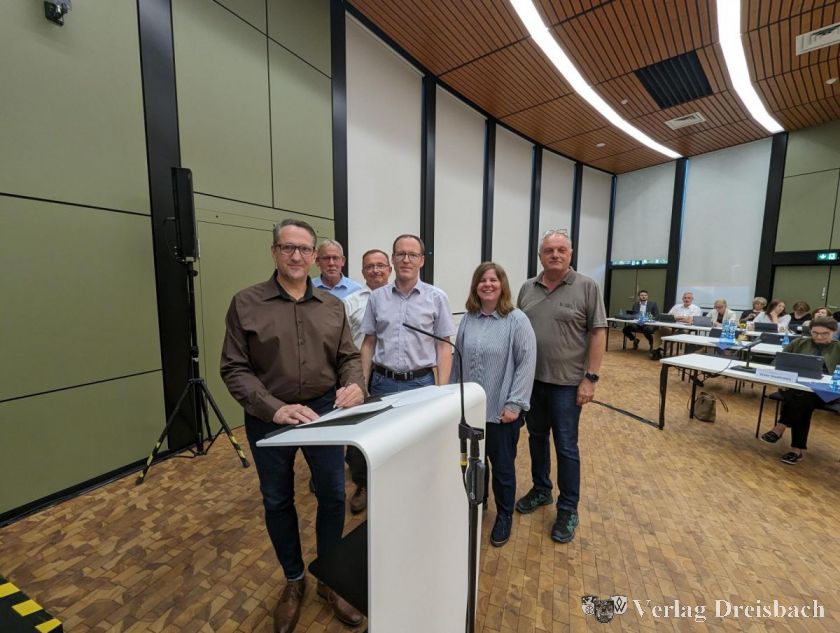 Stadtverordnetenvorsteher Georg Reuter (2. von links) sowie stellvertretend für ihre Fraktionen die Vorsitzenden (von links) Oliver Wiendl (FW), Michael Minnert (CDU), Dr. Marek Meyer (SPD), Nathalie Ferko (Bündnis 90/Die Grünen) und Norbert Reichert (FDP) bei der Unterzeichnung der Resolution am vergangenen Donnerstagabend.