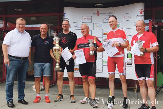 Die Siegerehrung konnte also ganz ungetrübt und in bester Stimmung von allen gefeiert werden. Peter Drnec bedankte sich bei allen Teilnehmern, allen Sponsoren und allen Helfern, insbesondere auch beim DRK Hattersheim, welches für die medizinische Versorgung der Touren im Stadtgebiet bereitstand und zum Glück keine Unfälle zu vermelden hatte. Bürgermeister Klaus Schindling freute sich, dass die Veranstaltung des RC Hattersheim wieder so viele Radsportler aus ganz Deutschland angezogen hatte. „Ich habe gehört, die Radfahrer der Sparkasse Aachen sind schon mit dem Fahrrad hier angereist – 260 Kilometer! Sie sind auch schon zum 11. Mal dabei und haben insgesamt inzwischen die 50.000 Kilometer hier vollgemacht. Das ist doch schon einen ganz besonderen Applaus wert“, fand der Bürgermeister und das Siegerehrungspublikum bestätigte das mit Beifall. Schindling lobte die ehrenamtliche Arbeit beim RC Hattersheim, mit der in jedem Jahr wieder der GIRO „mit viel Power auf die Beine gestellt“ wird. „So was könnte eine Stadt gar nicht leisten“, ist sich der Bürgermeister sicher.
