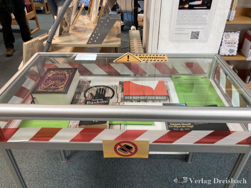 Das Verbot des Buches „Die satanischen Verse“ von Salman Rushdie im Iran wird den meisten Betrachtern der Ausstellung bekannt sein. Bei Angriffen, auch auf Übersetzer des Werkes, wurden inzwischen 38 Menschen getötet, Rushdie selbst überlebte 2022 einen Anschlag nur knapp. Ein weiteres „bannend book“ ist das Werk von Margaret Atwood mit dem Titel „Der Report der Magd“. Auf einem zweiten Regal waren weitere Bücher ausgestellt: Das Bildnis des Dorian Gray, Frankenstein, Anne Franks Tagebuch, „Wer die Nachtigall stört“ von Harper Lee, das Buch von Malala Yousafzai, der pakistanischen Kinderrechtsaktivistin, und viele mehr. Auch das Kinderbuch über einen Pinguin mit zwei Papas von Edith Schreiber-Wicke ist in einigen Ländern verboten. Zusammenfassend kann man sagen, dass gerade in USA die Bücher verboten werden, die über Homosexualität, eine Abweichung vom klassischen Familienbild, von farbigen Menschen oder selbstbewussten Frauen, die gegen den Strom schwimmen, berichten. In der Stadtbücherei in Hattersheim gab es an dem Regal eine Aufforderung, “bannend books“ zu lesen, da diese Bücher ein Statement für Vielfalt und Meinungsfreiheit seien. Die Lektüre könne dabei helfen, unterschiedliche Perspektiven kritisch zu hinterfragen und gesellschaftliche Probleme der Vergangenheit und auch Gegenwart zu verstehen.
