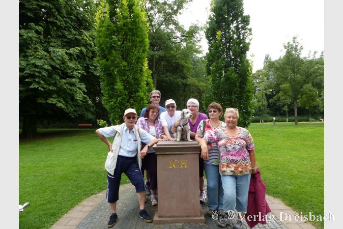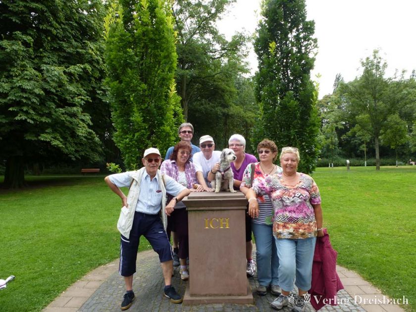 Es wurde zunehmend schwül und ein wenig wolkig. Nach der Frage, warten auf die Primus Linie oder laufen – entschlossen die Teilnehmer sich mutig zu letzterem. Das Foto am ICH-Denkmal mit dem kleinen Willy in der Mitte entstand, als es noch trocken von oben war. Wenig später fing es an zu regnen und entwickelte sich zu einem länger anhaltenden Wolkenbruch. Die Wanderer retteten sich von Brücke zu Brücke, und als es ganz schlimm wurde, hinauf zur Straße in eine Bushaltestelle am Frankensteiner Platz. Kein Faden war mehr trocken. Glücklicherweise konnte mit einem Bus zum Hauptbahnhof gefahren werden. Der Regen war warm und Humor ist, wenn man trotzdem lacht.