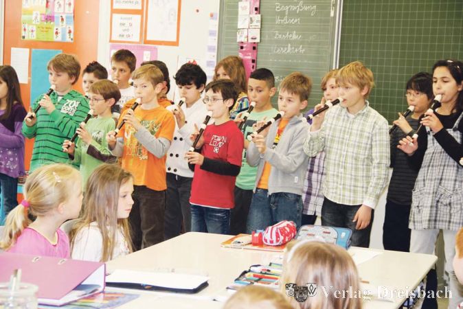 Die Kindergartenkinder wurden im Klassenraum der „Koalas“ mit einem flotten kleinen Blockflöten-Konzert und fröhlichem Chorgesang begrüßt: „Gehe gut gelaunt in den Tag, weil hier jeder dich mag – heute lese ich dir vor und du spitzt das Ohr!“ In die zuerst etwas beeindruckten Gesichter der kleinen Besucher stahl sich nach und nach doch das eine oder andere Lächeln, manche wippten und klatschten sogar mit. Als die Viertklässler die in den letzten Wochen extra gebastelten Namensschilder an „ihre“ Kindergartenkinder verteilten und sie mit in ihre „Lese-Ecke“ nahmen, war das Eis gebrochen. Das Klassenlehrer-Team Sabine Liewig und Anja Klein freute sich daran, wie fürsorglich die großen sich um die kleinen Kinder kümmerten, ihnen vorlasen und mit ihnen bastelten. „Die Schüler haben schon vor drei Wochen persönlich adressierte Einladungen an die Kindergartenkinder geschrieben, jedes Kindergartenkind hat seinen persönlichen ,Lesepartner' hier in der Klasse. Seit zwei Wochen beschäftigen wir uns im Deutsch-, Musik-, und Kunstunterricht und auch im Wochenplan mit dem Vorlesetag, wir haben natürlich Lesen und auch viel Vorlesen geübt“, berichtete Sabine Liewig von den Vorbereitungen in der Klasse. „Alle haben selbst überlegt, was man zu dem Buch, welches sie zum Vorlesen ausgesucht haben, basteln könnte und haben das auch erst mal selbst ausprobiert, damit heute alles klappt.“