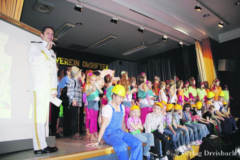 Der Moderator des Abends, Christian Seelmann, nahm in weißer Kapitänsuniform das Publikum im vollbesetzten Haus der Vereine mit auf den „Flug TV 1886“ der „Okriftel Air“ und schon der Start in den Abend war mitreißend und sehr gelungen: Katja Prenzer und Julia Anthes hatten für das „Bordkino“ einen „Film“ gestaltet, der – angefangen bei Turnvater Jahn, über die Kriegszeiten bis zu den musikalischen Erinnerungen an Bossanova, Rock 'n' Roll, Boney M. und Abba – tatsächlich 125 Jahre Revue passieren ließ. In liebevoll gestalteten Kostümen wurde geturnt, getanzt und schließlich symbolisch von kleinen und großen „Bauarbeitern“ mit karierten Hemden und gelben Helmen die Turnhalle des TVO gebaut. Unterstützt wurde die Illusion des „Bordkino“ mit moderner Technik – vom Laptop aus wurden Filme und Bilder zusätzlich zu den Darbietungen auf der Bühne an eine Leinwand projiziert, Lichteffekte und Musikauswahl waren perfekt. Und da alle Abteilungen des TVO an diesem „Bordkino“ beteiligt waren, war am Ende die Bühne fast zu klein, um allen Mitwirkenden zum „Bordkino-Finale“ Platz zu bieten.