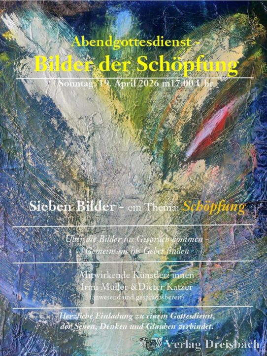 Die beiden Künstler Dietmar Katzer und Irmi Muller sind mitwirkend beim Gottesdienst und präsentieren ihre sieben Bilder, die sie in den vergangenen Monaten zusammen zur Schöpfungsgeschichte gestaltet haben.