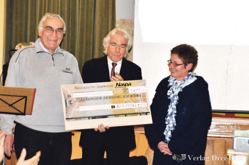 Als Überraschung konnte der Vorsitzende der Kolpingfamilie, Heinz Schlosser, dem Förderverein für das Katholische Vereinshaus, vertreten durch Dr. Gerold Buschlinger, einen Scheck über 2.477 Euro überreichen.