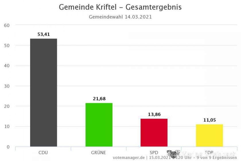 Der Trend, der sich am Sonntagabend um kurz nach 22 Uhr nach dem Eingang aller Schnellmeldungen (darunter versteht man diejenigen Stimmzettel, auf denen die jeweilige Wählerin oder der Wähler eine Liste gewählt hat, also ohne Kumulieren und Panaschieren) aus den neun Krifteler Wahlbezirken abgezeichnet hat, wird sich aller Voraussicht nach bewahrheiten: Neuesten Zahlen vom Montag um 14.20 Uhr zufolge verteidigt die CDU ihre absolute Mehrheit bei der Gemeindewahl mit 53,41 Prozent der Wählerstimmen. Vor fünf Jahren meisterte man diese Hürde mit 56,4 Prozent noch etwas klarer.