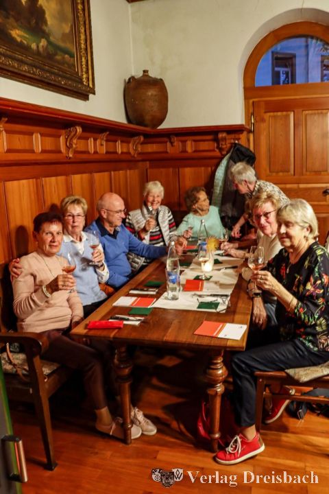 Dann aber wollten die rund 45 Teilnehmerinnen und Teilnehmer (die aktuelle Erkältungswelle hatte die Gruppe leider etwas reduziert) einen der wichtigsten Wirtschaftszweige der Stadt erkunden, den Weinbau. Dazu wurde die Poppenschänke aufgesucht, eine idyllische alte Mühle, die von der Familie Meiser schon lange betrieben und als Gutsausschank genutzt wird. Zunächst führte der Juniorchef durch den historischen Weinkeller. Danach ging es in die urgemütliche Gaststube mit originaler Einrichtung von 1892 zur Weinverkostung. Vom Silvaner bis hin zum Spätburgunder probierte sich die Gruppe durch diverse Weine und jede/r hatte die Gelegenheit, den ganz persönlichen Lieblingswein zu finden, oder den vorzüglichen alkoholfreien Traubensaft zu verkosten.