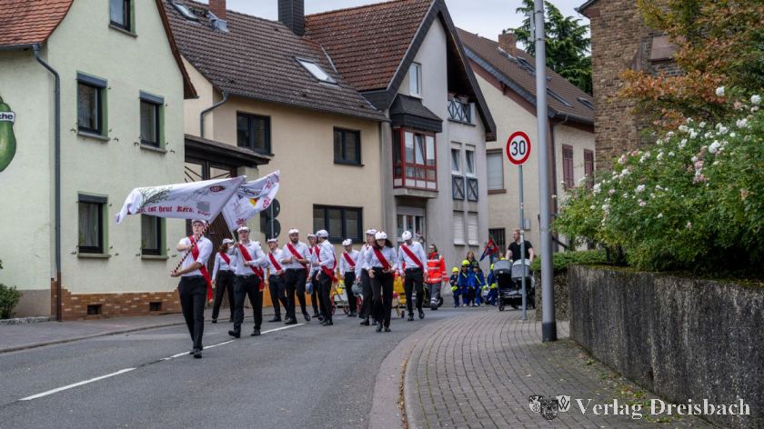 Mitten in der Saison befindet sich aktuell das Brass & Drum Corps Kriftel. Zwischen der Generalprobe zu den European Drum Corps Championships am vergangenen Freitagabend und eben jenem Wettbewerb an diesem Samstag ließ man es sich nicht nehmen, auch noch beim Krifteler Kerbeumzug mitzumarschieren. Und schließlich waren auch wieder die Rathausspitze, sprich: Bürgermeister Christian Seitz und der Erste Beigeordnete Martin Mohr zusammen mit dem Vorsitzenden der Gemeindevertretung Alexander Feist auf den Beinen, allesamt mit Bembel und Pappbechern in der Hand, um den Schaulustigen den ein oder anderen Schoppen einzuschenken.