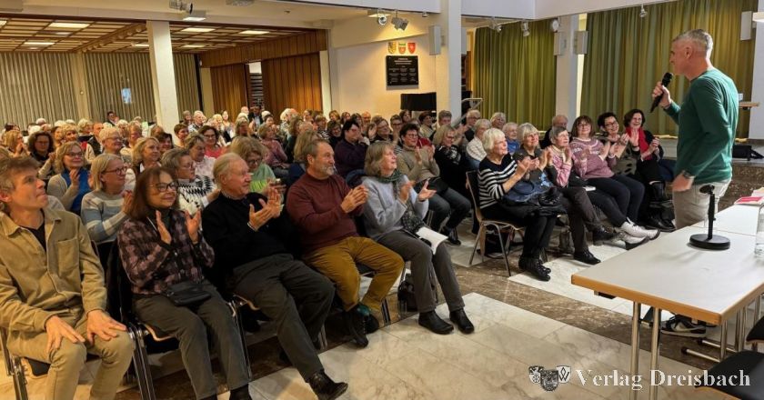 So voll war es bei der „Lesebühne“ im Foyer des Rat- und Bürgerhauses noch nie: Mehr als 100 Besucherinnen und Besucher kamen zur Lesung mit Tim Frühling – die Veranstaltung war ausverkauft. Weil der Andrang größer ausfiel als erwartet, reagierte die Gemeinde flexibel und schuf kurzfristig mehr Raum, damit alle Platz fanden.