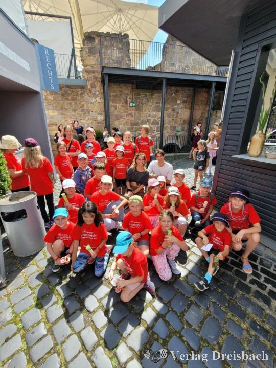 Nach Vorstellungsende wurde das vom Kulturforum spendierte Eis als willkommene Abkühlung genossen und das Glück war auch dieses Mal wieder auf der Seite der Kinder, denn plötzlich entdeckten sie die beiden Hauptdarsteller, die sich auf den wohlverdienten Heimweg machten. „Ronja“ und „Birk“ wurden begeistert begrüßt und so ließen es sich die Krifteler Kids nicht nehmen, ein Gruppenfoto und Autogramme mit nach Hause zu nehmen.