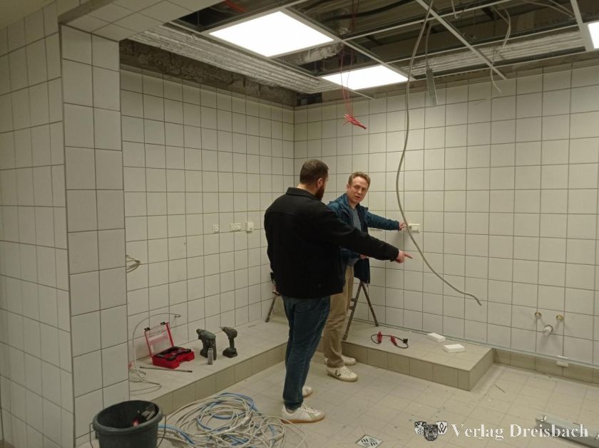 Die Sanierungsarbeiten im neuen Gastronomiebereich des ehemaligen Restaurants in den Schwarzbachhallen gehen voran, ein Ende ist absehbar. „Kommende Woche werden die Kücheneinrichtung und Elektrogeräte angeliefert“, teilt jetzt der Erste Beigeordnete Martin Mohr mit, der sich bei Bauamtsmitarbeiter Burhan Bilgic vor Ort über den Fortgang der Arbeiten informierte. Die Räumlichkeiten sind inzwischen komplett gefliest, Trockenbau, Elektromontage und Arbeiten an der Lüftungsanlage so gut wie abgeschlossen.