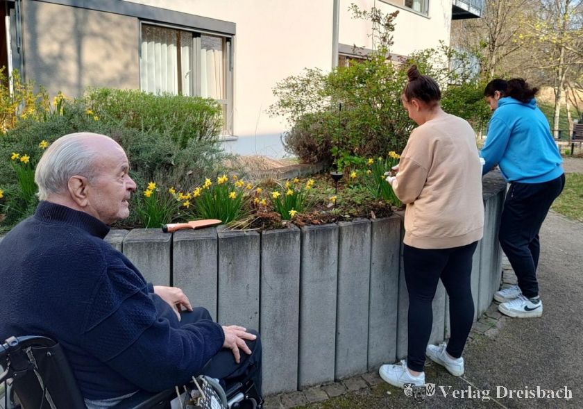 Beim zweiten Durchgang ging es praktischer zu, denn auf dem Programm stand die Arbeit im Grünen. Die beiden Gärten des Kursana Domizils sollten für den Frühling vorbereitet werden. Die Schüler entfernten Unkraut und Laub, mähten den Rasen, lockerten die Erde auf und setzten Blumenzwiebeln. Einige Senioren beteiligten sich und viele staunten, wie fleißig die Kinder sind. Eine Bewohnerin war besonders fleißig und sagte: „Als Bauerntochter bin ich es gewohnt und habe immer gern mit angepackt. Es gibt doch nichts Schöneres, als an der frischen Luft gemeinsam zu arbeiten.“