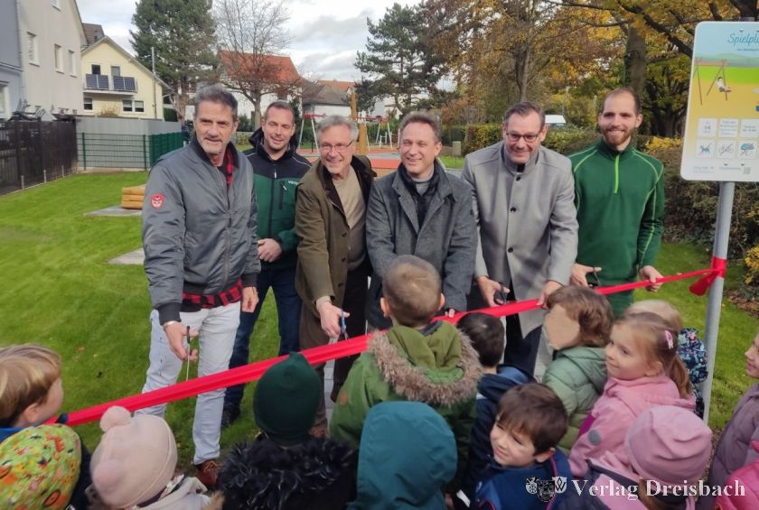 Die Krifteler Kinder konnten es kaum erwarten: Am Dienstag wurde nun endlich der beliebte Spielplatz „Am Mühlbach“ nach der kompletten Um- und Neugestaltung offiziell eröffnet! Zur kleinen Feierstunde am frühen Nachmittag war auch eine Kindergruppe der Kita Vogelnest gekommen: Diese durfte als erste den neuen Spielplatz stürmen. Zuvor durchschnitten gemeinsam Bürgermeister Christian Seitz, der Erste Beigeordnete Martin Mohr, der zuständige Bauamtsmitarbeiter Michael Knittel und Vertreter der beteiligten Firmen Vonovia (Planung) und Galabau Pfeffer (Anlage und Bepflanzung) symbolisch ein rotes Band. Auch mehrere Mitglieder der Gemeindegremien und interessierte Bürgerinnen und Bürger waren gekommen.