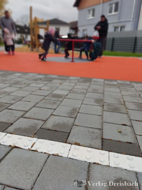 Besonders wichtig waren der Gemeinde und ihren Bürgerinnen und Bürgern die Integration inklusiver Spielgeräte gewesen: Dazu gehören zum Beispiel eine Schaukel mit Inklusionssitzen, aus denen man nicht herausfallen kann, und ein Drehkarussell, das von Kindern im Rollstuhl genutzt werden kann. Von den beiden Eingängen des Spielplatzes ausgehend können sich sehbehinderte Menschen anhand eines erhöhten Bordsteines sicher auf dem Gehweg bewegen. Taktile Platten weisen auf neue Spielbereiche hin. Die Spielbereiche mit inklusiven Geräten wurden mit leuchtend orangem Fallschutz versehen, damit sehbehinderte Menschen sich aufgrund des Kontrastes zur Umgebung besser orientieren können.