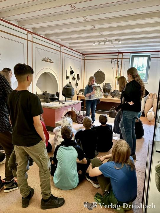 Zu sehen gab es dort viel: das mit Wandgemälden geschmückte atrium zum Beispiel und den Garten im Innenhof, der mit mediterranen Pflanzen bepflanzt war und einen Hauch von römischem Luxus vermittelte. Überraschend: Das cubiculum hatte keine Fenster, Licht war nicht nötig, denn dort wurde ja nur geschlafen. Auch im triclinium lag man auf Betten, und das meist zu dritt, aber dort wurde gegessen. Abgegessene Knochen warf man übrigens einfach unter den Tisch und die fettigen Finger wischte man sich an den Haaren hübscher Sklavinnen ab. In der culina konnte die Schülergruppe sehen, wo Sklaven das Essen zubereitet haben, und eine Geruchsprobe des berühmt berüchtigten Garum nehmen, einer Würzpaste, die aus vergorenen Fischabfällen hergestellt wurde. Sehr gewöhnungsbedürftig!
