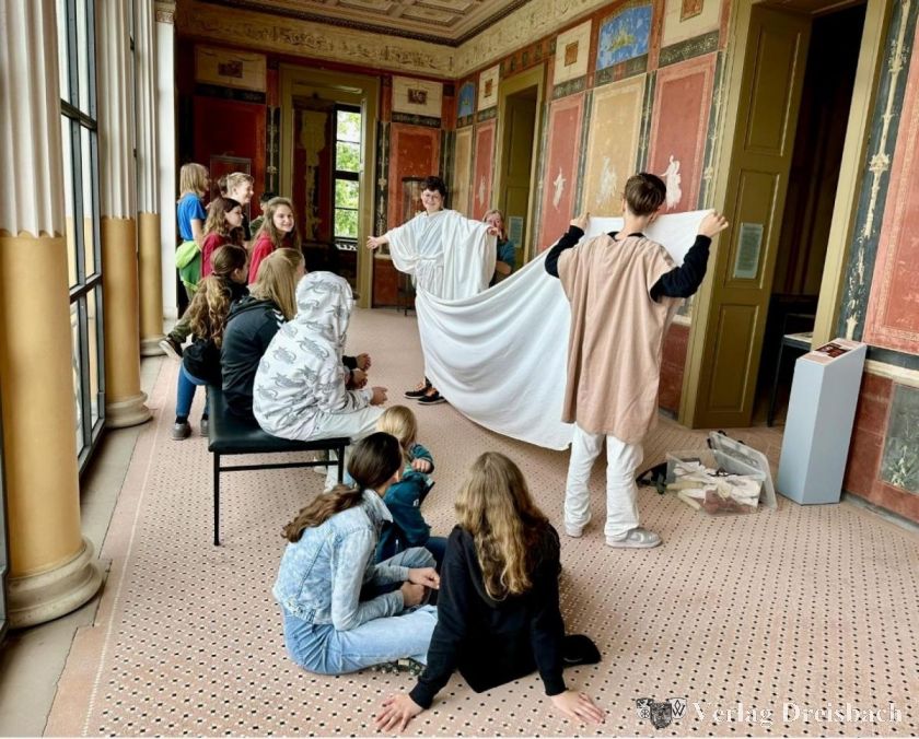 Am Ende durften sich die Schüler sogar als Römer verkleiden: Da standen der Hausherr und die Hausherrin standesgemäß in einer Toga und ihr Sklave in einer Tunika aus einfachem Leinenstoff.
