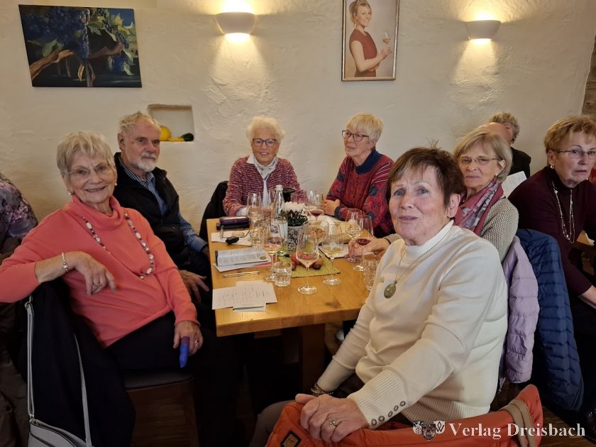 Natürlich wurde auch gesungen. Schon im Bus hatten alle unter dem strengen Regiment des Vorsitzenden Gerhard Mantel einige Lieder geübt und dabei die Zeile „Ein Geburtstag ist ein schönes Fest“ kurzerhand in „Eine Weinprob‘ ist ein schönes Fest“ umgedichtet. So wurde es vorgetragen – und genau so war es. Bleibt anzumerken, dass ein guter Schluck Wein der Sangeslust und Stimmkraft offenbar förderlich ist.