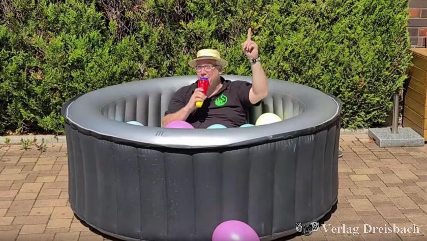Und auch die anderen markanten Ereignisse eines jeden Lindenblütenfestes fanden ihren Weg in das knapp 14-minütige Video: Eine Variation des alljährlichen Luftballonwettbewerbs führte diesmal Michael Wipfler alleine im aufblasbaren Pool im eigenen Garten durch, eine Anleitung zum Mixen einer eigenen Erdbeerbowle wurde geliefert, die Präsentation eines Bratwurststandes machte Appetit auf das eigenhändige Grillen und die Kerbeborschen präsentierten "zusammen" in einzeln aufgenommenen Videos - und das erstaunlich synchron - einen launigen Trinkspruch, bevor man schließlich ins nächste Video wechseln konnte: Die Partyband Deja vu nahm extra für das Lindenblütenfest 2021 ein komplettes Konzert auf, das sicher in vielen Wohnzimmern und Gärten für kleine Lindenblütenfeste im privaten Rahmen die passende musikalische Untermalung bot.