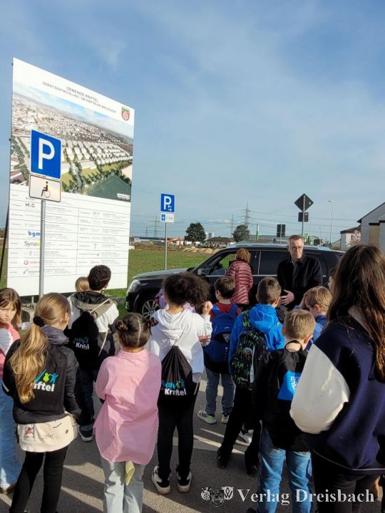 Zur dritten Sitzung im Schuljahr 2023/2024 hatte die Vorsitzende des Kinderbeirats, Tanja Seitz, die Teilnehmer am Mittwoch zur einem Außentermin eingeladen: Pünktlich um 16 Uhr versammelte sich die Gruppe vor der Gemeindebücherei am Bahnhof. Der Erste Beigeordnete der Gemeinde Kriftel, Franz Jirasek, war ebenfalls anwesend. Tanja Seitz begrüßte die Kinder und vorab ging es zuerst zum Bauschild für das neuen Baugebiet „Krifteler Wäldchen“. Franz Jirasek erklärte den Kindern, was hier entstehen soll und ließ die Kinder schätzen, wieviel Kosten auf die Gemeinde zukommen und wie viele neue Wohnungen und Gewerbeobjekte sich ansiedeln sollen. Die Kinder staunten nicht schlecht, wie groß dieses Projekt wird.