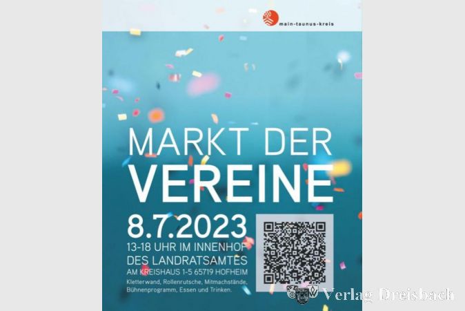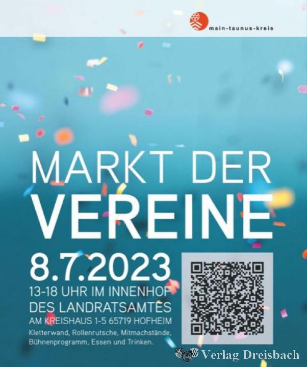 Gemeinsam mit Vereinen aus allen Städten und Kommunen des Kreises veranstaltet die Kreisverwaltung am Samstag, 8. Juli, den ersten „Markt der Vereine“: Über 50 Vereine bieten von 13 bis 18 Uhr im Innenhof des Landratsamtes ein buntes Programm für Groß und Klein mit Bühnenshows und Mitmachständen an. Für das leibliche Wohl gibt es Kaffee, Kuchen, Waffeln, Popcorn, Würstchen, Steaks, kalte Getränke und Cocktails. „Auch Krifteler Vereine sind dabei, also schauen Sie vorbei“, lädt Kriftels Bürgermeister Christian Seitz die Bürgerinnen und Bürger der Obstbaugemeinde zum Kommen ein.