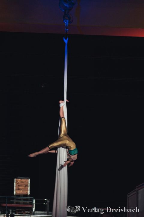 Reizvoll bei diesem Auftritt war der Kontrast zwischen der riesigen Maschinenhalle mit ihrem technischem Equipment einerseits und den raffiniert beleuchteten Turnerinnen, die zu Musik in großer Höhe ihre Eleganz, Kraft und Beweglichkeit zeigten andererseits. Sie ernteten langanhaltenden Applaus. Es traten auf: Johanna Bock, Katja Hoppmann, Camilla Klee, Emilia Sevda und Teresa Tambour.