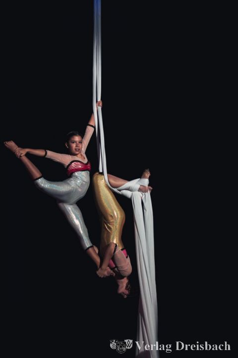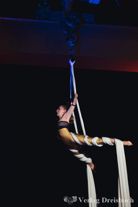 Nach langer, coronabedingter Auftrittspause hat das Luftakrobatik-Team endlich sein Können wieder unter Beweis stellen können. Vor einem internationalen Publikum traten die fünf Akrobatinnen im Alter von 11 bis 27 Jahren Ende Oktober an der Technischen Universität Darmstadt während einer wissenschaftlichen Maschinenbau-Konferenz auf. Am weißen Vertikaltuch, das mit seinen zwei Bahnen rund fünf Meter hoch an einem Kran an der Hallendecke befestigt war, zeigten die Akrobatinnen teils allein und teils zu zweit ihre Übungen, scheinbar schwerelos. Besonders spektakulär waren die sogenannten Faller, bei denen die Akrobatinnen das Tuch um den Körper wickeln und aus großer Höhe in die Tiefe hinabfallen – um kurz über dem Boden sicher zu stoppen.
